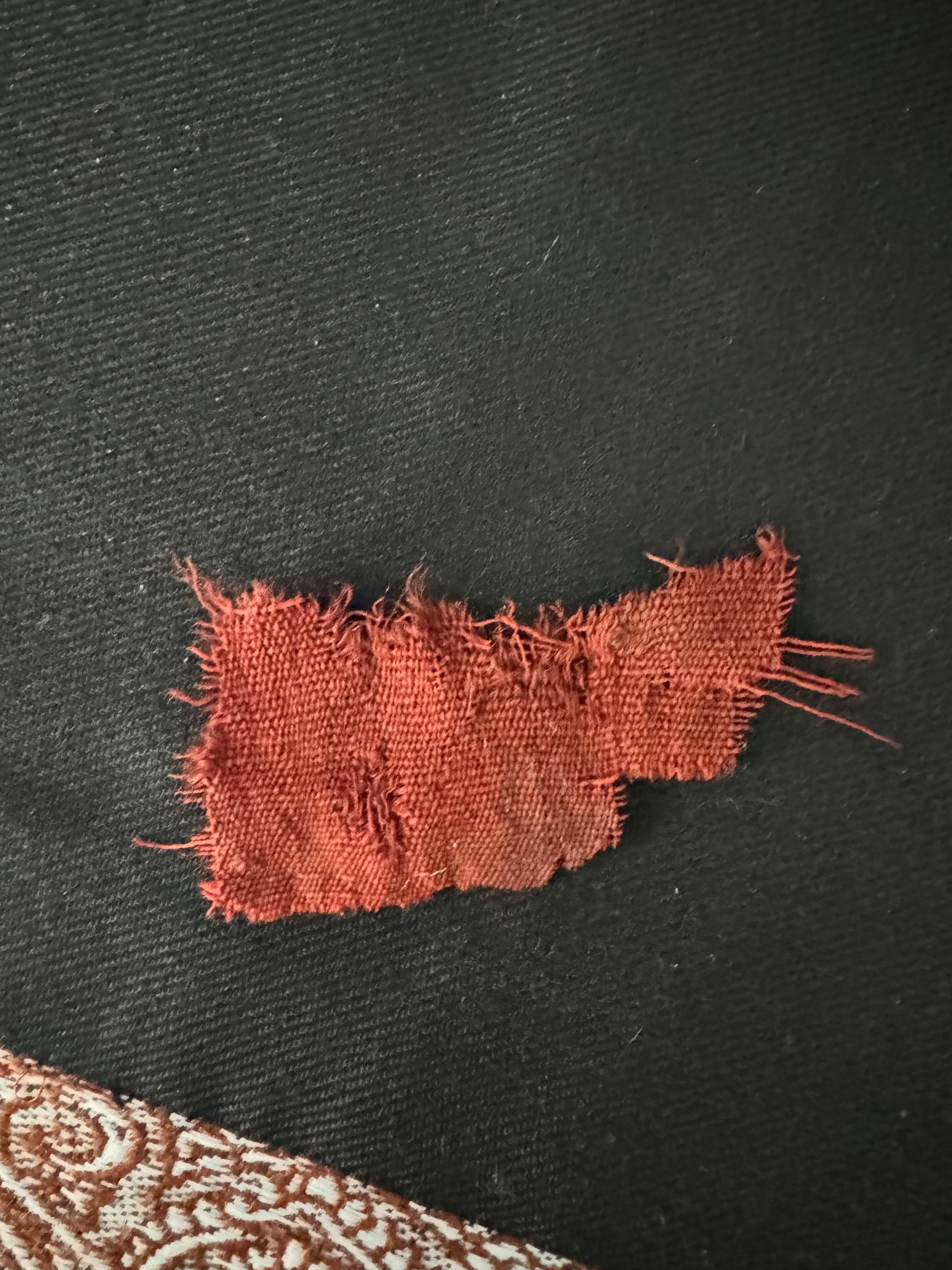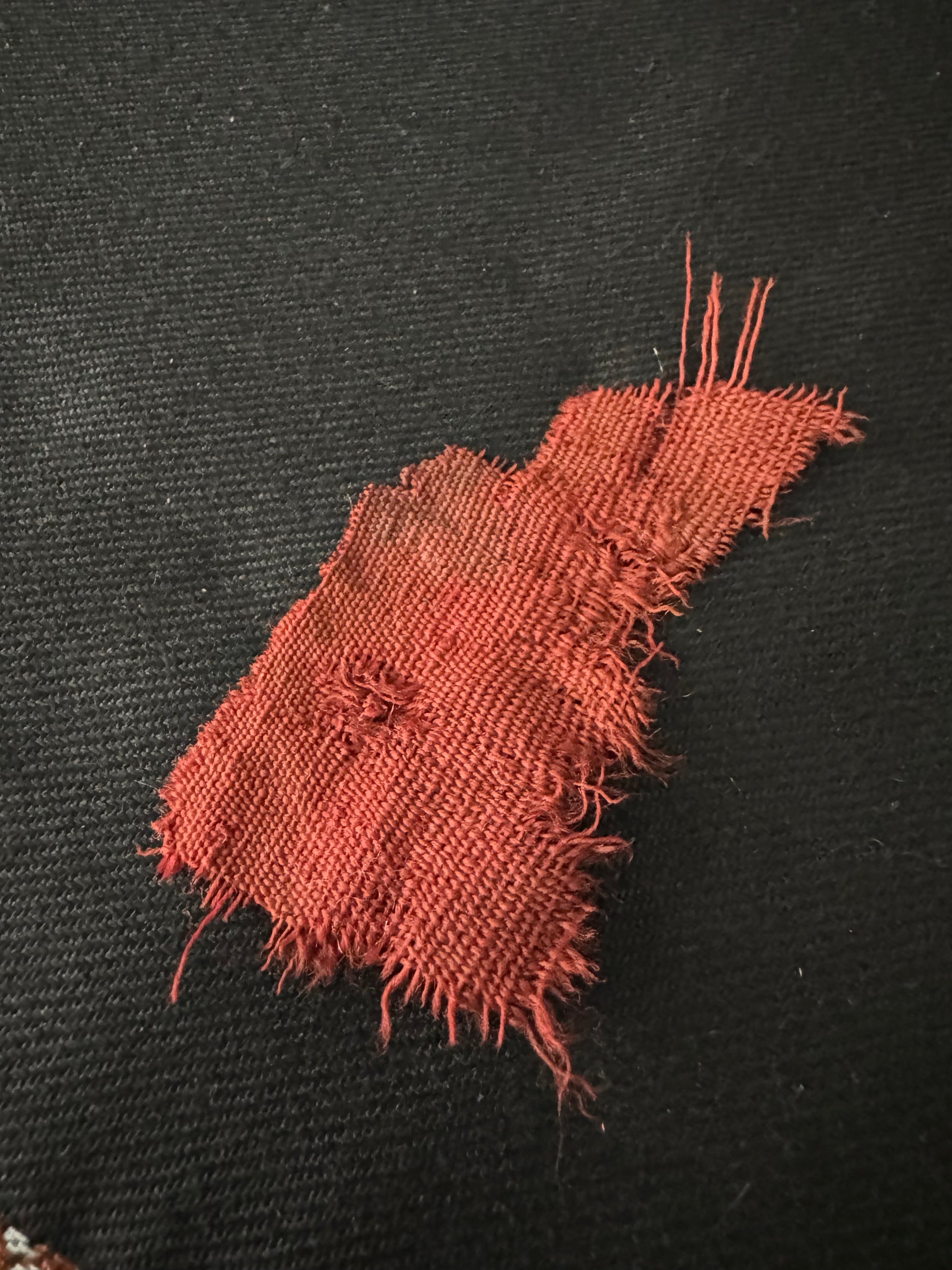 - Authentic cutting of the shirt cloth (small size, preserved measures 6.5 cm long and width of 3.3 cm